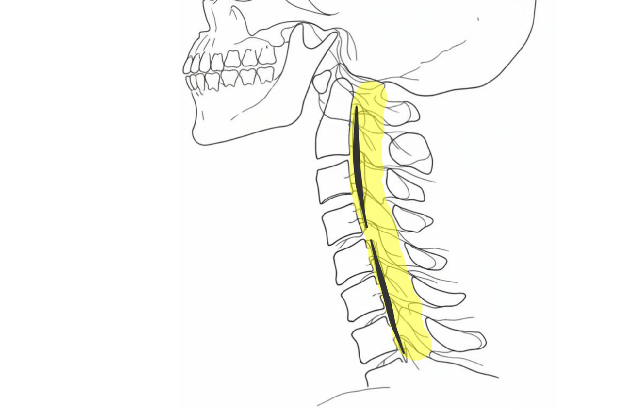図の、薄黄色が神経の通ている脊柱管のスペース。その中の、黒い縦線部分が後縦靭帯の骨化を示しています。